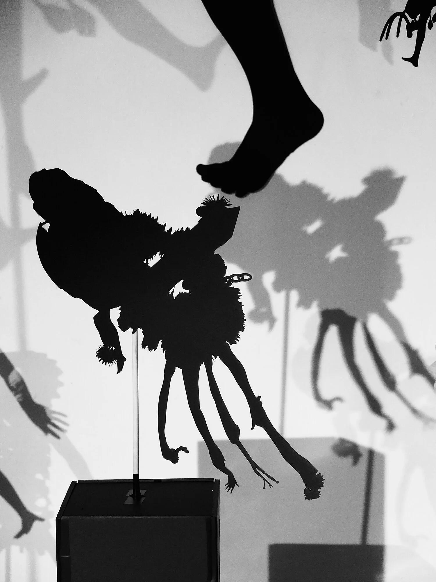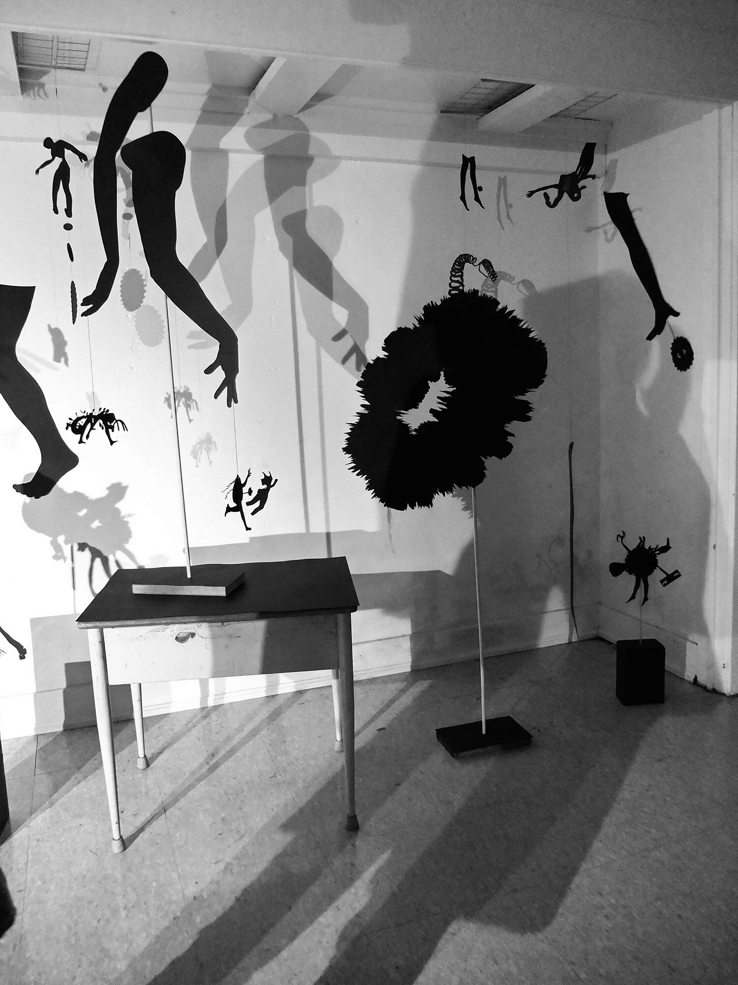 Shifting Boundaries is a site-specific installation using shadow puppets, bodily movement, light, and shadow. Emerging from a process of photomontage in the project Composite Hybrids, individual photographs and computer-generated imagery are assembled into complex hybrid forms. Taking a detailed digital outline of these forms, they are then translated into black flat paper cutouts using a laser machine. Part human and part Other, this work takes its inspiration from Donna Haraway’s Cyborg Manifesto and its rejection of rigid boundaries between human, animal, organism, and machine. Set up using multiple lights, the observer’s shadow is cast into the installation as they walk by. In this moment, bodily boundaries become skewed and undefined; sparking a curiosity and play with the shadows. Depending on the viewer’s location, their shadow can hide, reveal, or blend in with the other shadows. Simultaneously breaking apart the body and putting it back together; this project is an attempt to blur the defining lines of bodies as a way to expose a heterogeneous perspective towards bodies of all shapes, sizes, and identities.